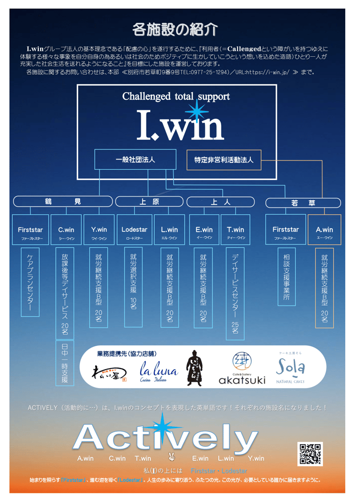 2015年7月 若草事業所 設立 就労継続支援B型事業 A.win・相談支援事業所 First star