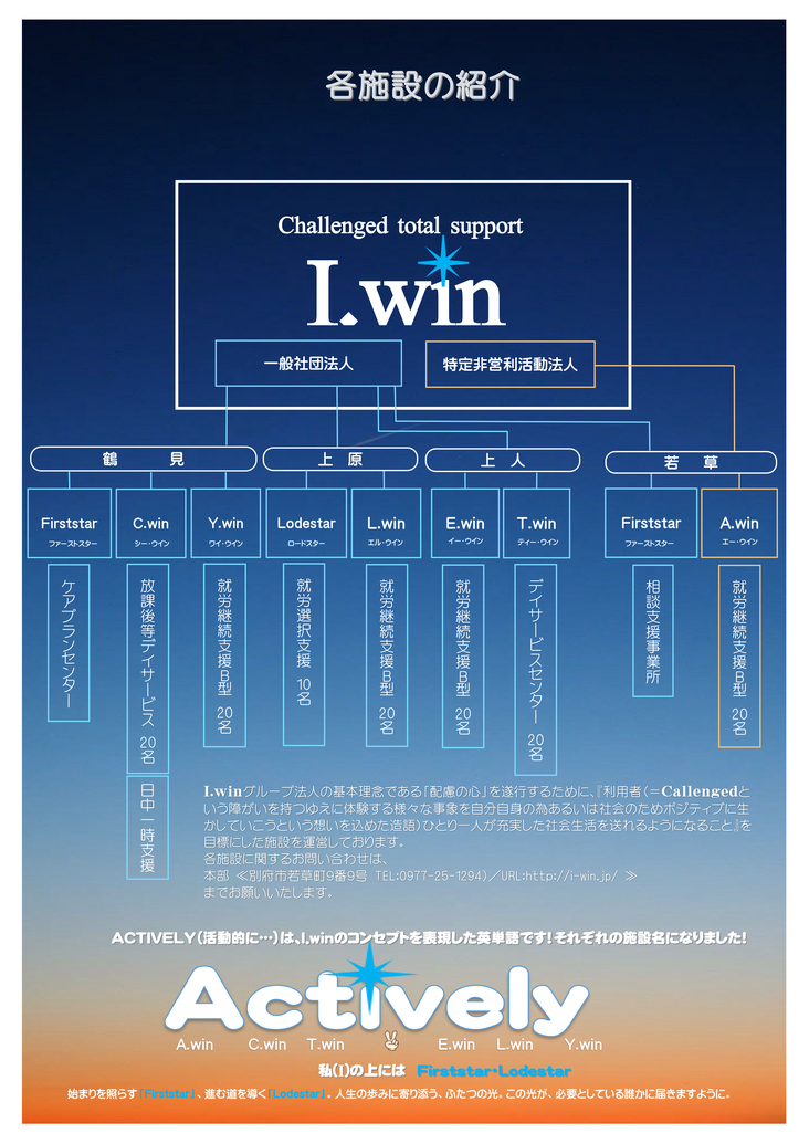 2015年7月 若草事業所 設立 就労継続支援B型事業 A.win・相談支援事業所 First star